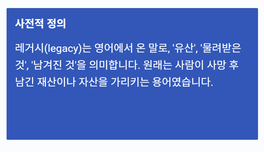 👉 레거시 뜻은 과거로부터 이어져 온 유산이나 시스템을 의미하며,