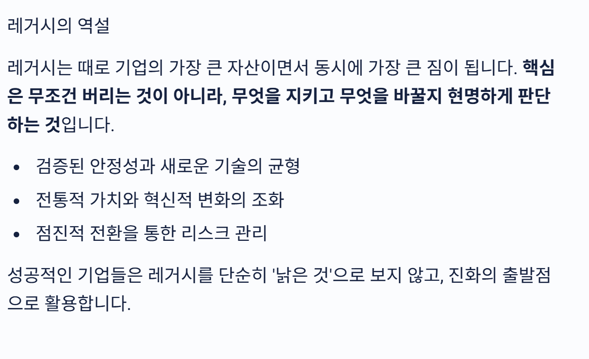 그런데 레거시는 단순히 “옛날 것”을 의미하는 단어가 아닙니다.