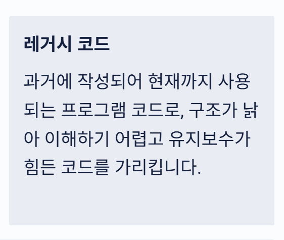 과거에 작성된 코드로, 구조가 낡아 유지보수가 어려운 코드