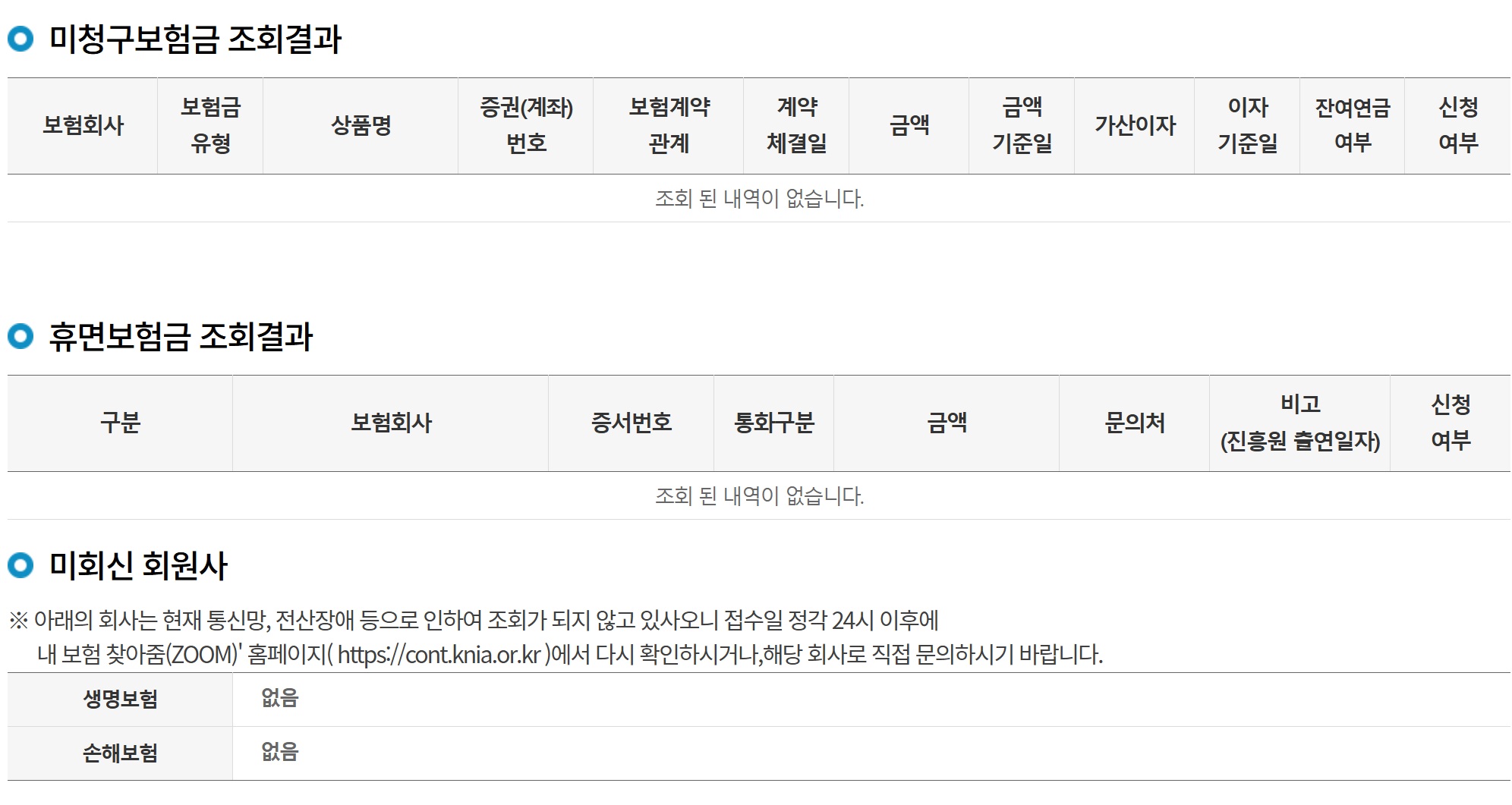 안타깝게도 미청구보험금이며, 휴면보험금이며 조회 된 내역이 없다고 나오네요..