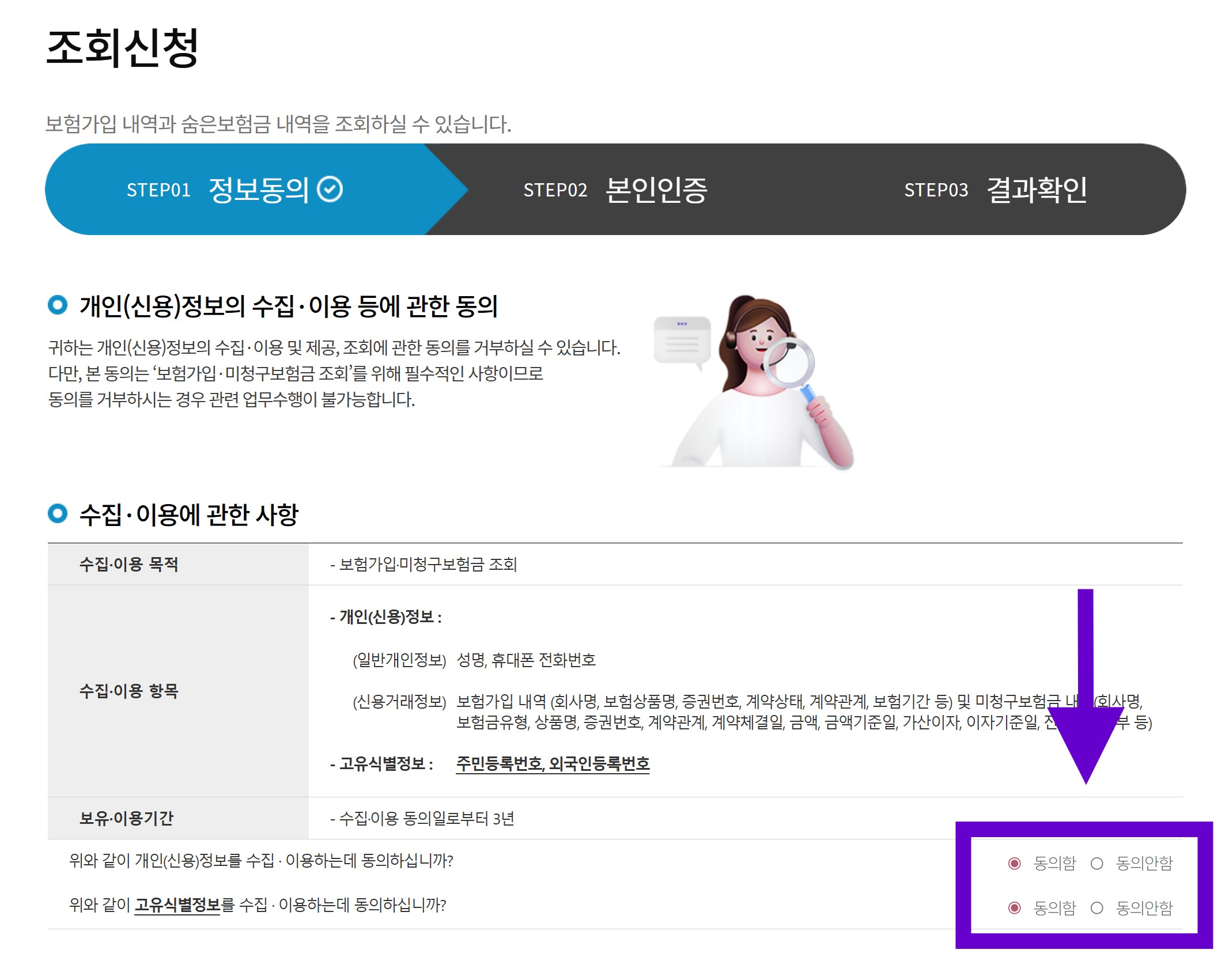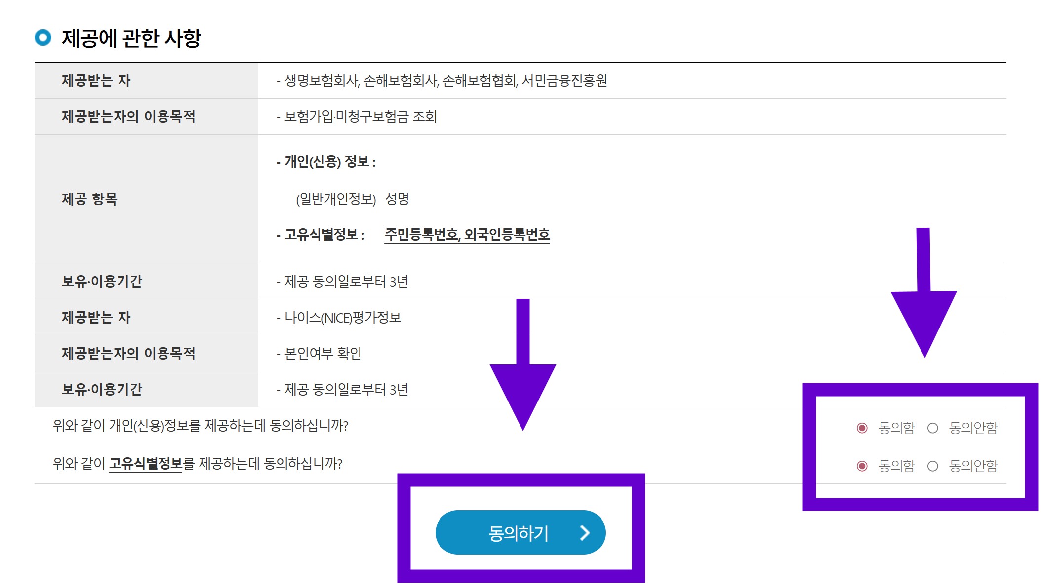 보험가입조회 자체가 불가능해지므로 반드시 동의가 필요합니다.