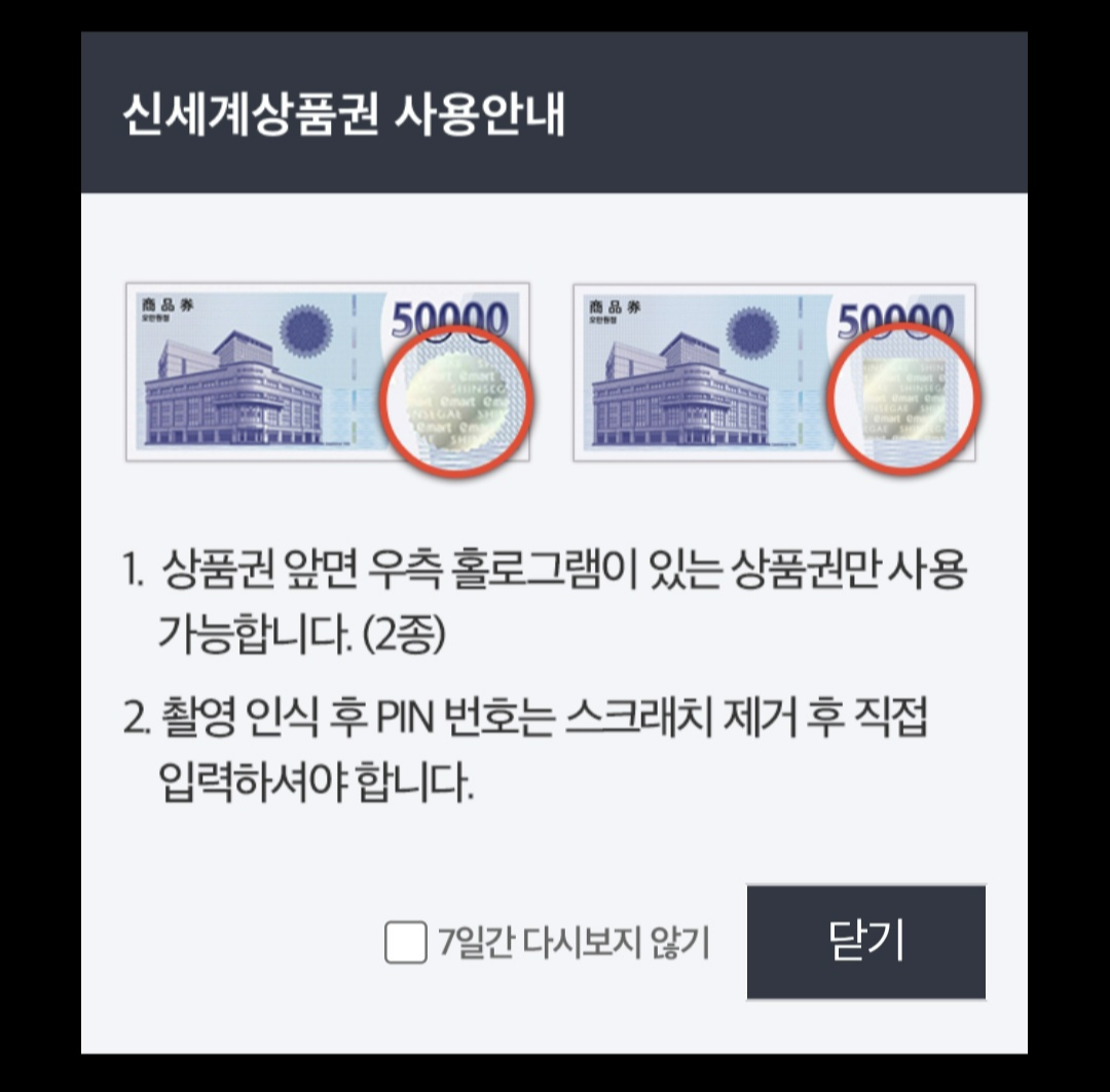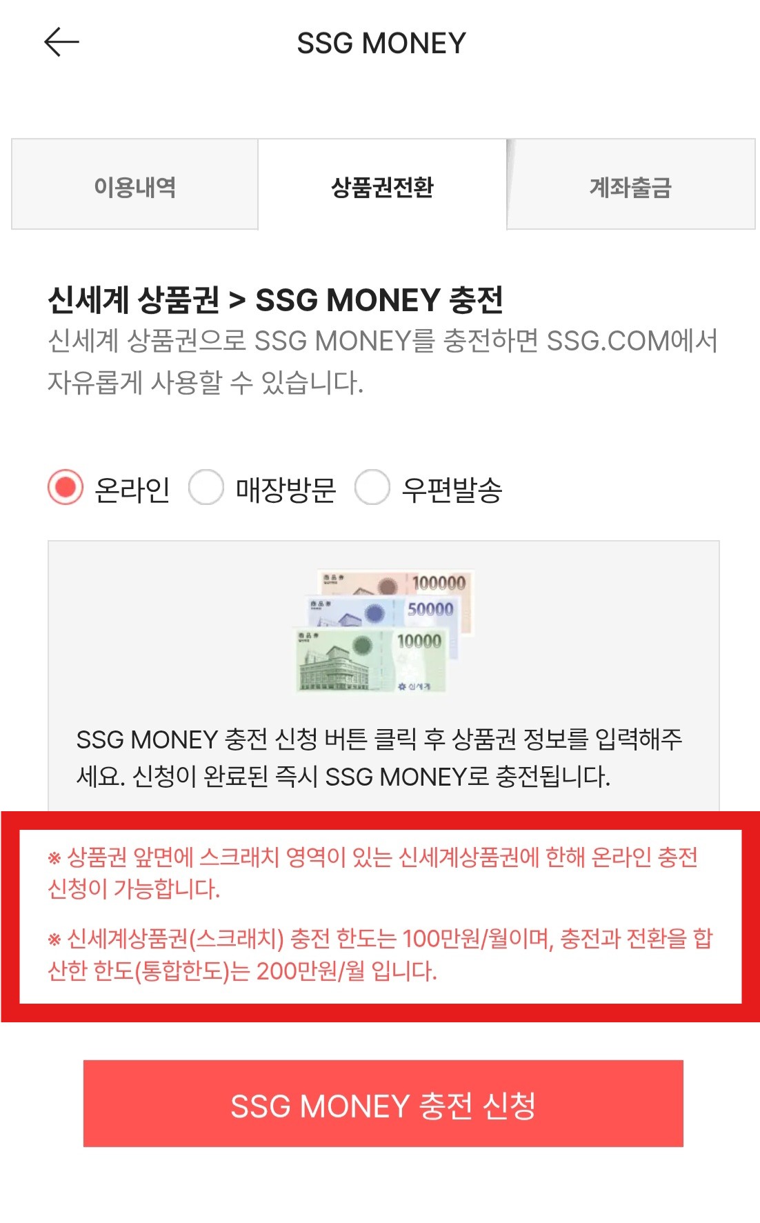 스크래치 영역이 있는 신세계상품권만 온라인 충전 신청이 가능하다는 점 참고하세요!