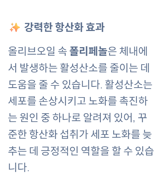 올리브오일에는 폴리페놀이라는 항산화 물질이 포함되어 있습니다.