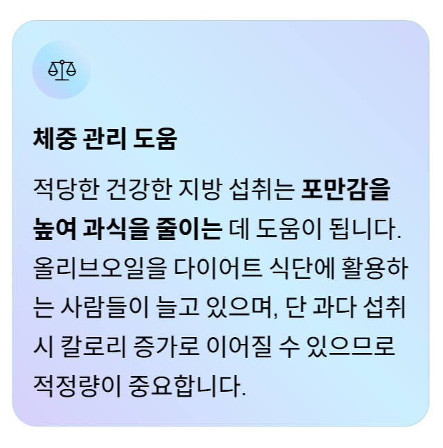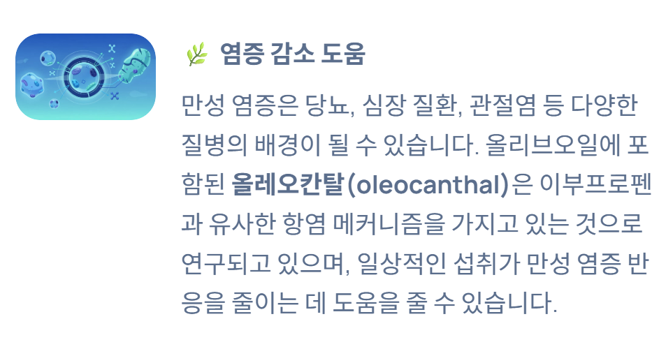 이러한 성분 덕분에 올리브오일 효능은 다양한 건강 분야에서 연구되고 있습니다.