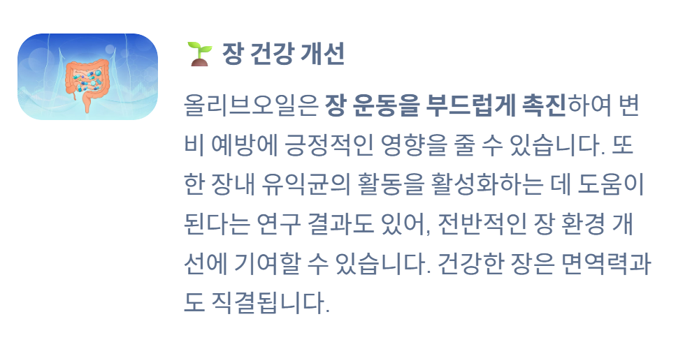 올리브오일은 장내 환경을 개선하는 데 도움을 줄 수 있습니다.