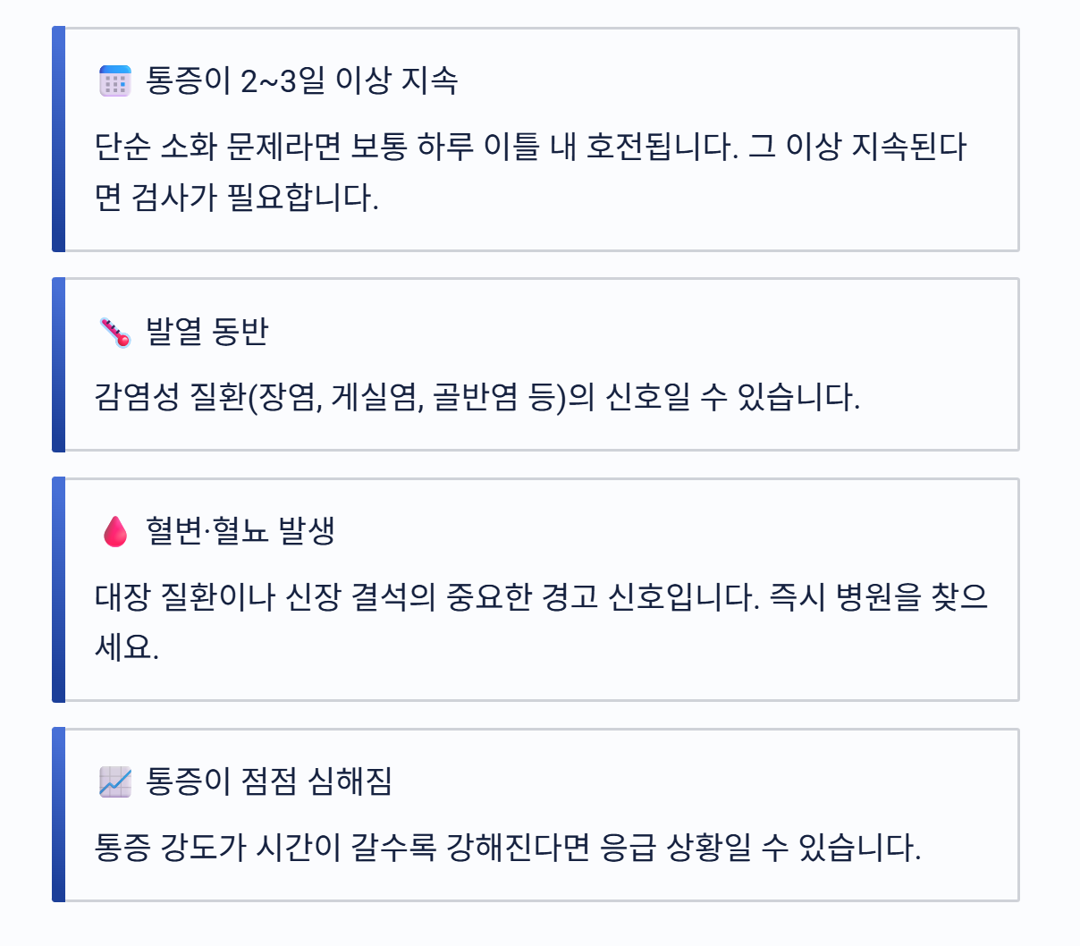 특히 게실염, 신장 결석, 여성 질환은 빠른 진단이 중요합니다.