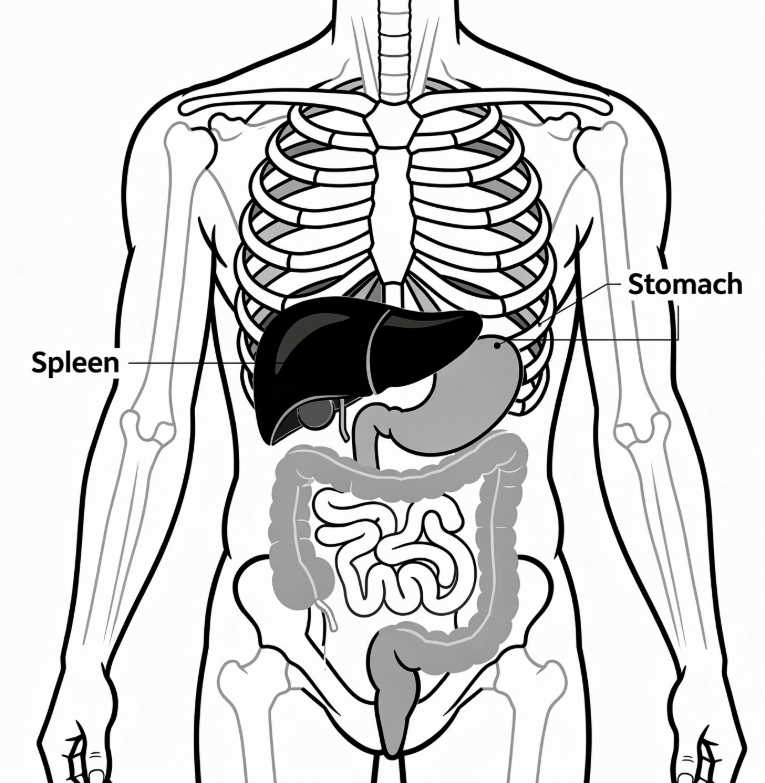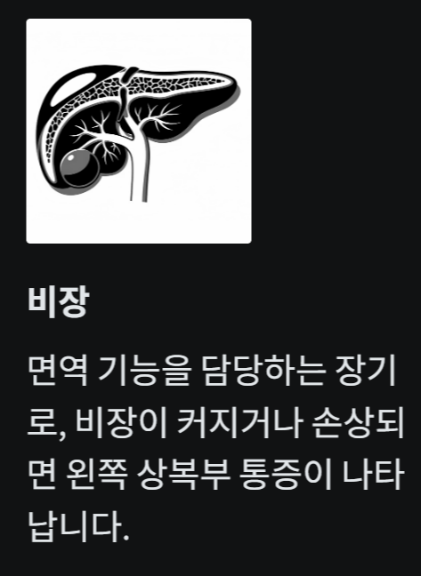 비장은 왼쪽 상복부에 위치한 장기입니다.