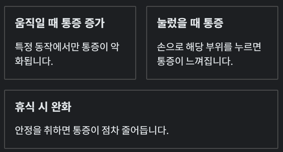 특히 통증이 지속되거나 강도가 심해진다면 반드시 병원에서 정확한 진단을 받는 것이 중요합니다.