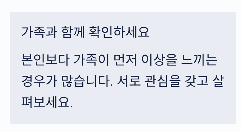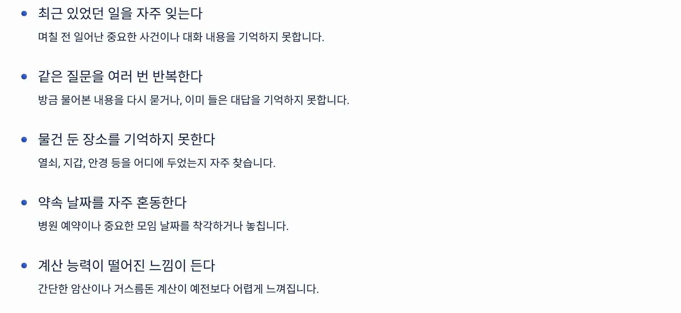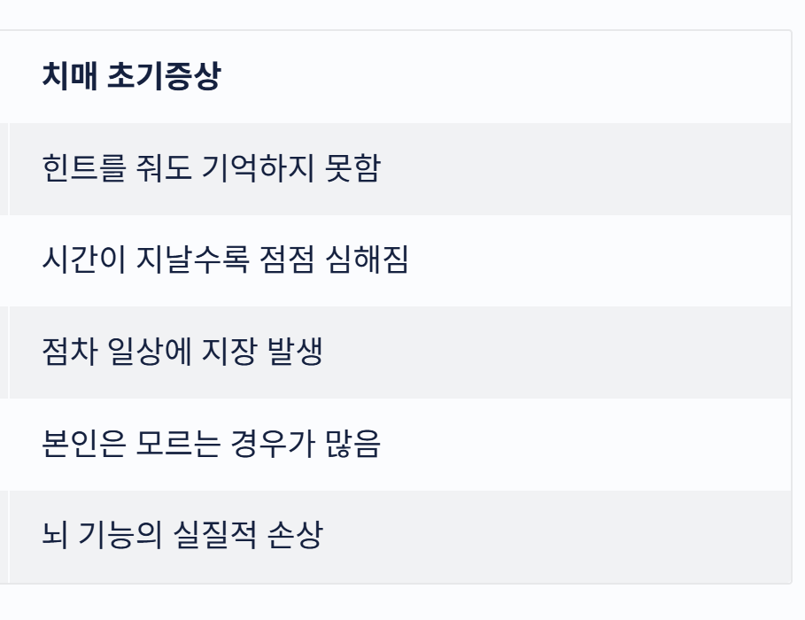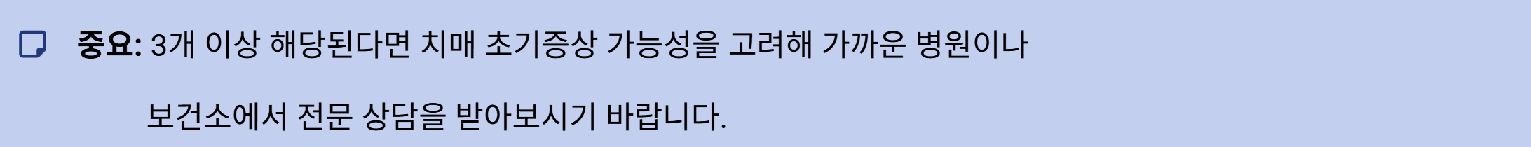 👉 3개 이상 해당된다면 치매 초기증상 가능성을 고려해 전문 상담을 받아보는 것이 좋습니다.