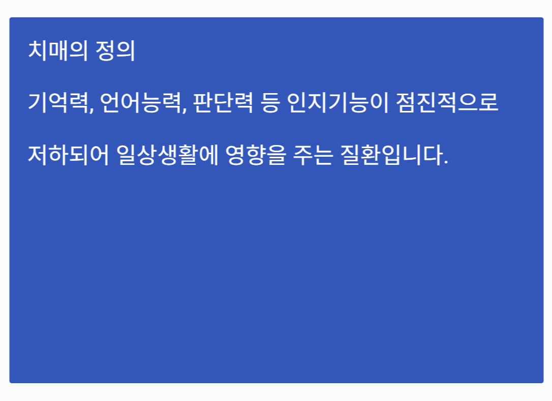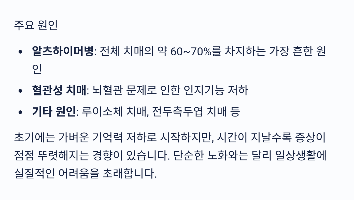 치매는 기억력, 언어능력, 판단력 등 인지기능이 점진적으로 저하되는 질환입니다.