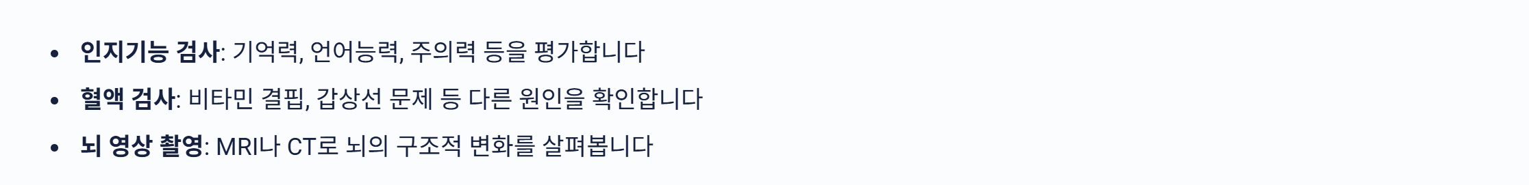 병원에서는 인지기능 검사, 혈액 검사, 뇌 영상 촬영 등을 통해 진단합니다.