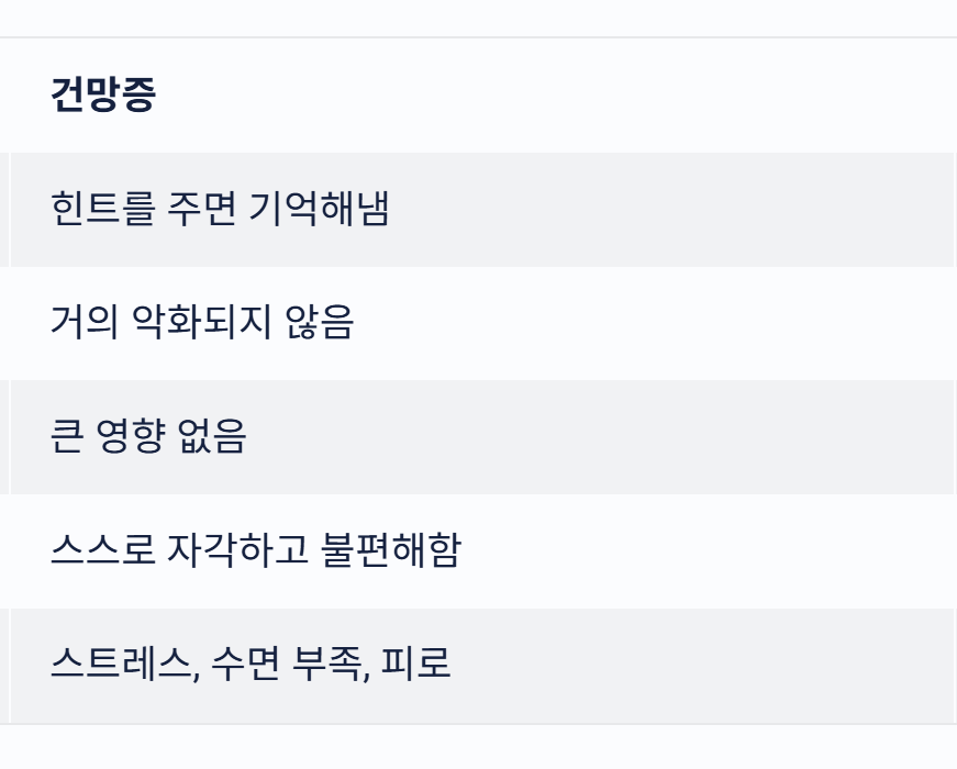 초기에는 가벼운 기억력 저하로 시작하지만, 시간이 지날수록 증상이 점점 뚜렷해지는 경향이 있습니다.