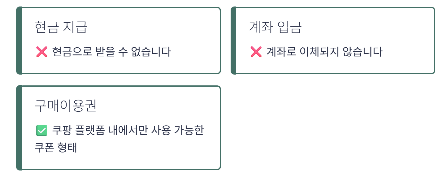 이 아닌, 쿠팡 플랫폼 내에서만 사용 가능한 구매이용권(쿠폰) 형태로 지급됩니다.