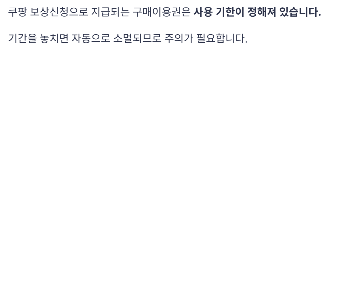 쿠팡 보상신청으로 지급되는 구매이용권은 사용 기한이 정해져 있습니다.