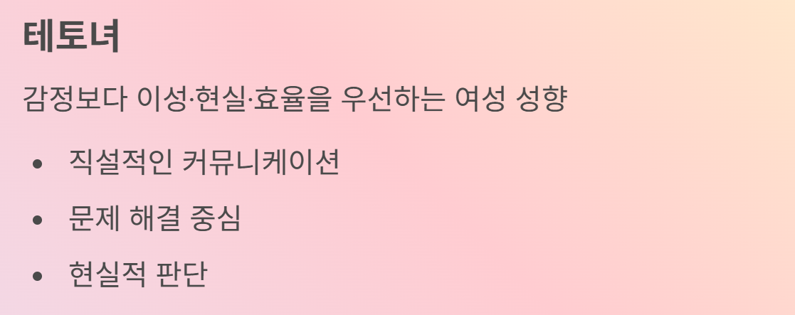 - 테토녀: 남성 호르몬인 테스토스테론+여성(녀) 합친 신조어 = 감정보다 이성·현실·효율을 우선하는 여성 성향